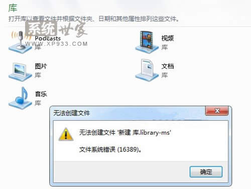 在Win7中使用“庫”功能可以讓電腦中的文件更易于管理和查找。在默認情況下,Win7系統會提供文檔庫、音樂庫、圖片庫和視頻庫這幾個常用庫。當然,我們也可以根據需要或自己的使用風格在Win7系統中創建自己的庫。“庫”功能是Win7系統才開始出現,它可以幫你把文件更好的分類,可以創建文檔庫、音樂庫、圖片庫和視頻庫等,也可以新建庫。但是最近,有朋友向小編詢問,自己在電腦上新建“庫”的時候,出現了“無法創建文件 ‘新建 庫.library-ms’文件系統錯誤(16389)”的提示信息,正如下圖所示。