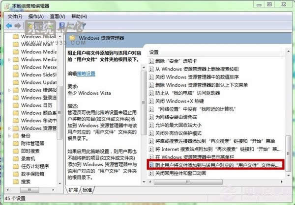 第三步、鼠標點擊打開“Windows 資源管理器”,在右側窗口中找到‘阻止用戶將文件添加到與該用戶對應的“用戶文件”文件夾的根目錄下’,并且雙擊打開該文件。