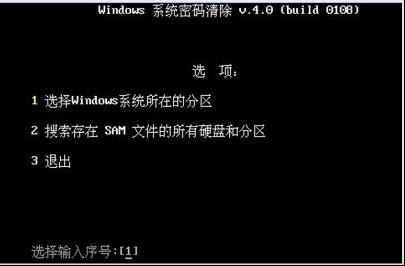 3、選擇清除windows密碼,確定后出現(xiàn)如下界面,選擇系統(tǒng)所在分區(qū)“1”,當(dāng)然你不知道的情況下亦可使用搜索并按回車。