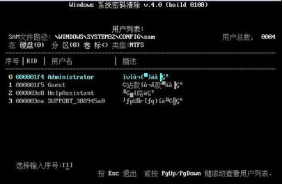 5、按照屏幕說明按確定, 工具會(huì)列出所有帳戶,選中 我們要清除的帳戶,然后回車,選對清除密碼,按Y鍵就開如清除操作。