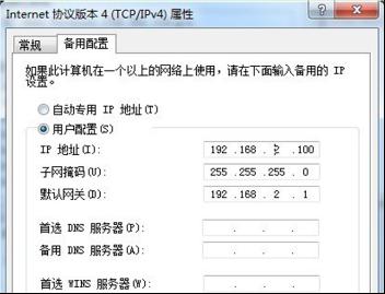 6、切換到“備用配置”標(biāo)簽頁選,選擇“用戶配置”,手動輸入IP地址,自動獲取的是1段的,在這里手動輸入2段的ip,點擊“確定”保存。