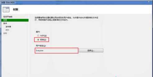3、在創(chuàng)建新規(guī)則界面中執(zhí)行新規(guī)則向?qū)АT谙旅娴慕缑嬷校x擇權(quán)限,在操作處選擇“拒絕”,在“用戶或組”處選擇EVERYONE。