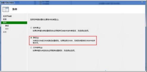 4、在左側(cè)窗格中選擇“條件”,在條件界面中,設(shè)置“限制”路徑,點(diǎn)擊進(jìn)入下一步操作,在瀏覽文件按鈕中選擇病毒文件,再點(diǎn)擊創(chuàng)建按鈕。