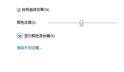 3、在Win7系統“窗口顏色”設置的界面中,在“顏色濃度”這個欄目的位置拉動滑動條設置顏色的透明程度。