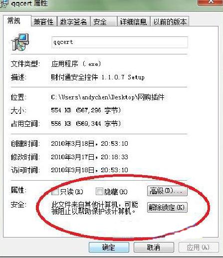 2、如果你討厭這個提示時,也是可以取消的,方法是:在你要運行的軟件上右擊選擇“屬性”,在打開的屬性窗口中的切換到“常規(guī)”選項卡,點擊“解除鎖定”按鈕,之后點擊“確定”退出,再次運行的時就不會再出現(xiàn)這個提示了 。