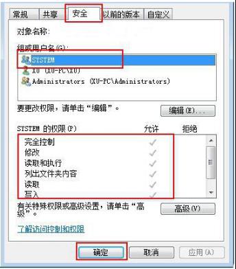 2、在打開的屬性窗口中,切換到“安全”標(biāo)簽頁,在“組或用戶名”欄中選擇登錄Windows的用戶名,然后再在“SYSTEM的權(quán)限”列表框中,將權(quán)限全部設(shè)置為“允許”,點(diǎn)擊“確定”按鈕保存即可。