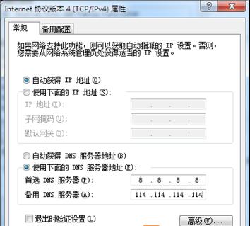 3、選擇“使用下面的DNS服務器地址”,分別填上 8.8.8.8 和 114.114.114.114 然后確定。