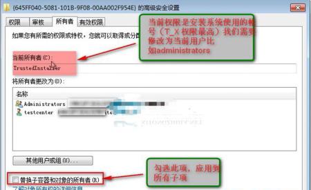 | Windows 7,中文名稱視窗7,是由微軟公司(Microsoft)開發的操作系統,內核版本號為Windows NT 6.1。Windows 7可供家庭及商業工作環境:筆記本電腦 、平板電腦 、多媒體中心等使用。Windows 7可供選擇的版本有:入門版(Starter)、家庭普通版(Home Basic)、家庭高級版(Home Premium)、專業版(Professional)、企業版(Enterprise)(非零售)、旗艦版(Ultimate)。 使用Windows7系統過程中,很多用戶都會通過刪除注冊表中的一些項來清除無效數據,怎么辦?其實這是由于權限不足的原因,現小編給大家介紹優化win7系統注冊表無法刪除注冊項出錯的解決方法,具體操作如下:![]() 1、在需要刪除的注冊表項上右鍵,選擇“權限”; 2、在彈出的設置窗口,點擊“高級”按鈕; 3、在打開的高級安全設置窗口,切換到“所有者”標簽頁,此時可看到所有者是“TrusteInstaller”這是一個Windows內部管理員帳戶,它權限非常高,而我們需要將把所有者更改為當前登錄帳戶,比如Administrator,點擊選擇所有者更改為administrators,同時勾選替換子容器和對象的所有者(相當于把該注冊表項下的子項都更改成當前所有者); 4、點擊應用、確定后返回到權限窗口,選擇當前用戶賬號為administrators。 5、刪除的時候還是提示出錯,請依次操作:需要操作的項上右鍵選擇權限——選擇當前的用戶名——高級——權限選項卡,點擊當前用戶名,同時勾選使用可從此對象集成的權限替換所有子對象的權限,點擊應用——確定即可) windows 7 的設計主要圍繞五個重點——針對筆記本電腦的特有設計;基于應用服務的設計;用戶的個性化;視聽娛樂的優化;用戶易用性的新引擎。 跳躍列表,系統故障快速修復等,這些新功能令Windows 7成為最易用的Windows。 |