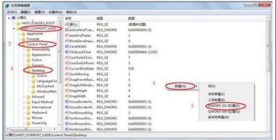 2、在注冊表編輯器依次展開到“HKEY_CURRENT_USER\Control Panel\Desktop”,