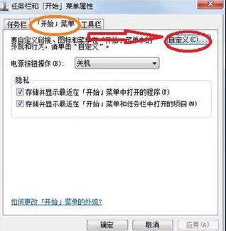 2、在打開的 “任務(wù)欄和開始菜單的屬性”中切換到 “開始菜單”標(biāo)簽,點(diǎn)擊“自定義”按鈕,如下圖: