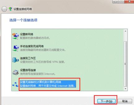 2、在彈出的“設(shè)置連接或網(wǎng)絡(luò)”窗口中,選擇“設(shè)置無線臨時(計算機(jī)到計算機(jī))網(wǎng)絡(luò)”項,然后點擊下一步按鈕,在彈出的窗口中再次點擊下一步按鈕。