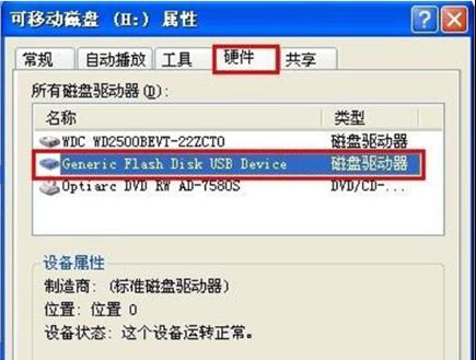 2、在彈出的屬性對(duì)話框中,切換到“硬件”標(biāo)簽頁,在“所有磁盤驅(qū)動(dòng)器”中選擇使用的U盤,然后點(diǎn)擊“屬性”按鈕。