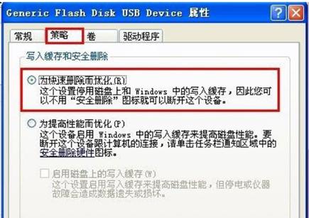 3、在彈出的屬性窗口中,切換到“策略”標(biāo)簽頁,選擇“為快速刪除而優(yōu)化”,然后點(diǎn)擊“確定”即可。