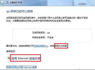 | Windows 7,中文名稱視窗7,是由微軟公司(Microsoft)開發的操作系統,內核版本號為Windows NT 6.1。Windows 7可供家庭及商業工作環境:筆記本電腦 、平板電腦 、多媒體中心等使用。Windows 7可供選擇的版本有:入門版(Starter)、家庭普通版(Home Basic)、家庭高級版(Home Premium)、專業版(Professional)、企業版(Enterprise)(非零售)、旗艦版(Ultimate)。 電腦公司Win7純凈版系統安裝快捷方便,性能穩定,操作簡單深得用戶的青睞,為了幫助用戶更好地使用Win7系統,下面小編給大家介紹電腦公司Win7純凈版系統中建立無線局域網的步驟。1、啟用無線網卡:首先確認無線網卡的驅動程序是正確安裝的,并將無線網卡天線開關打開。 2、點擊“開始——控制面板——網絡和 Internet——網絡和共享中心——設置新的連接或網絡”。 3、在打開的選項中選擇“設置無線臨時(計算機到計算機)網絡”,點擊下一步。 4、創建的網絡自定義網絡名并選擇合適的安全類型。 5、此時無線局域網已經可以使用,如果用戶想在電腦間共享文件,請按照如圖提示啟用文件共享即可。 6、如果用戶想要共享Internet連接,那么選擇“啟用Internet連接共享”即可。 通過以上設置后,其他電腦在無線網絡列表中選擇對應的SSID名稱并點擊“連接”就可成功訪問該無線局域網了。 windows 7 的設計主要圍繞五個重點——針對筆記本電腦的特有設計;基于應用服務的設計;用戶的個性化;視聽娛樂的優化;用戶易用性的新引擎。 跳躍列表,系統故障快速修復等,這些新功能令Windows 7成為最易用的Windows。 |