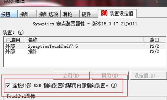 5.依次點擊“開始→控制面板→硬件和聲音→鼠標→裝置設定值→連接外部 USB 指向裝置是禁用內部指向裝置(選上勾)。
