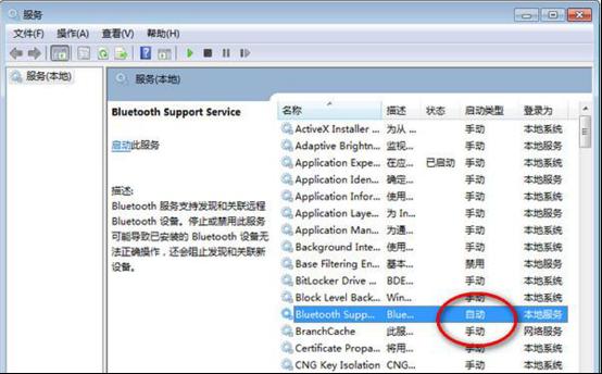 3、在彈出的“Bluetooth Support Service”服務設(shè)置窗口中,將啟動類型設(shè)置為自動,并將啟動改為服務,藍牙功能開啟了。