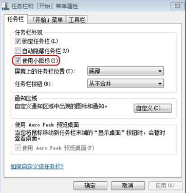 3、此時(shí)可能出現(xiàn)每個(gè)圖標(biāo)占用很大的空間,如果看著不順眼,可以右鍵-開始-屬性,勾選使用小圖標(biāo)-確定即可。
