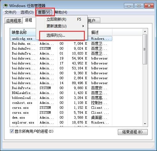 2、在打開的Windows任務(wù)管理器中,切換到“進程”標(biāo)簽頁,點擊菜單上的“查看——選擇列”;