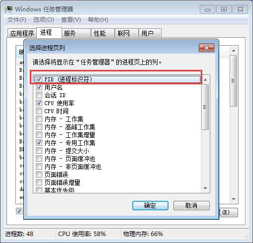 3、在選擇進程頁列中,勾選“PID(進程標(biāo)識符)”選項,點擊確定按鈕。