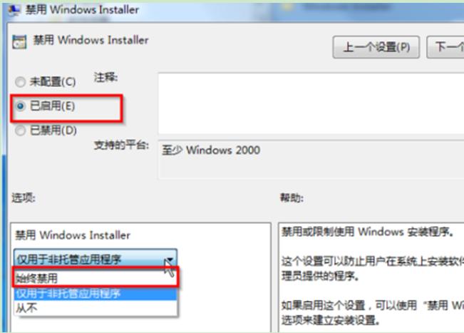 | Windows 7,中文名稱視窗7,是由微軟公司(Microsoft)開發的操作系統,內核版本號為Windows NT 6.1。Windows 7可供家庭及商業工作環境:筆記本電腦 、平板電腦 、多媒體中心等使用。Windows 7可供選擇的版本有:入門版(Starter)、家庭普通版(Home Basic)、家庭高級版(Home Premium)、專業版(Professional)、企業版(Enterprise)(非零售)、旗艦版(Ultimate)。 有時候,你的電腦不得不被電腦被他人使用,但是你也許會發現,多出了一些莫名其妙的軟件。怎么辦呢?如果你遇到此問題而煩惱,但又無法確保以后不被他人借用時,為了電腦安全考慮,請來看看禁止系統之家Win7系統隨意安裝軟件的設置方法吧。1、按“Win+R”打開“運行”窗口,輸入“gpedit.msc”命令后按回車,打開本地組策略編輯器。 2、在打開的組策略編輯器中,展開“管理模板——windows組件——windows installer”,然后在“禁用ms installer"項目上雙擊。 3、在打開的“禁用Windows Installer”窗口中,選擇“已啟用”,在“僅用于非托管應用程序”處選擇“始終禁用”,點擊“確定”保存后退出組策略。 通過以上步驟方法設置后,win7系統中就不會被隨意安裝軟件,有需要的用戶趕快動手吧。 windows 7 的設計主要圍繞五個重點——針對筆記本電腦的特有設計;基于應用服務的設計;用戶的個性化;視聽娛樂的優化;用戶易用性的新引擎。 跳躍列表,系統故障快速修復等,這些新功能令Windows 7成為最易用的Windows。 |