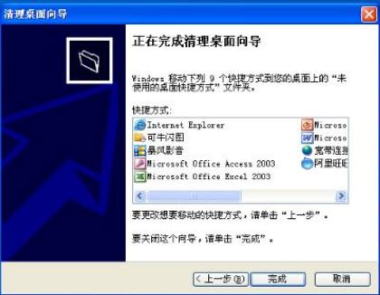 3、在“正在完成清理桌面向?qū)?rdquo;對(duì)話框中,查看快捷方式中的項(xiàng)目,以確認(rèn)要將它們從桌面上刪除,點(diǎn)擊完成。“清理桌面向?qū)?rdquo;將把選定的快捷方式移動(dòng)到未使用的桌面快捷方式文件夾之中,退出即可。
