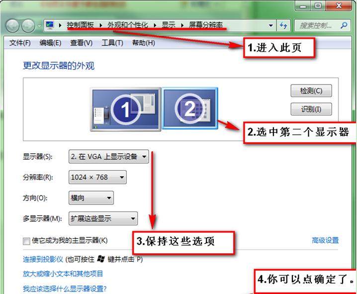 2、彈出屏幕分辨率窗口,選中第二個顯示器,保持下邊默認參數(shù)設(shè)置,點擊“確定”即可。