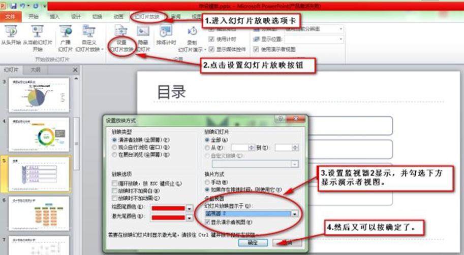1、進入PPT上方一欄的幻燈片放映選項卡,點擊設(shè)置幻燈片放映按鈕,在彈出的放映方式窗口中對放映屬性進行設(shè)置,在幻燈片顯示于的下拉菜單中選擇監(jiān)視器2,在“顯示演講者視圖”前面打勾,點擊“確定”保存即可。