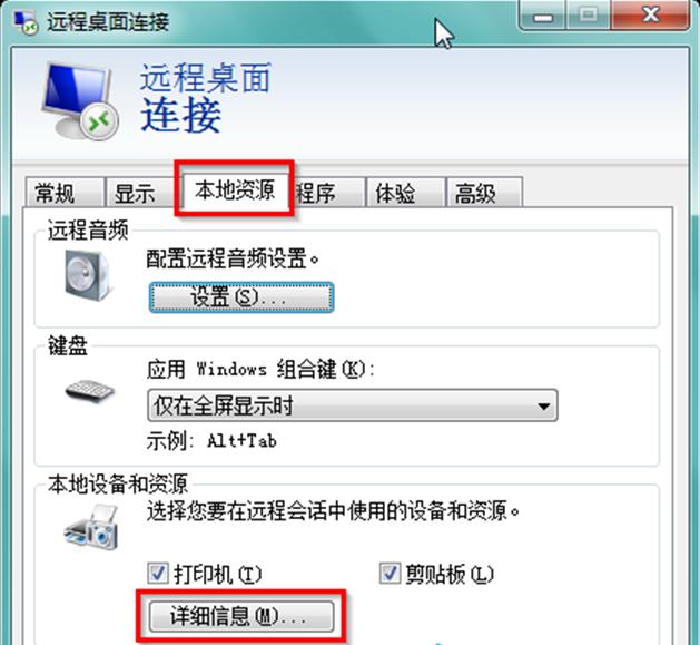 3、出現(xiàn)遠(yuǎn)程桌面連接的選項(xiàng)窗口,切換至“本地資源”標(biāo)簽頁,在本地設(shè)備和資源下點(diǎn)擊“詳細(xì)信息”。