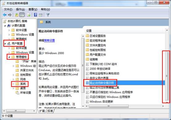 2、在打開的本地組策略編輯器,從左邊欄目中依次進(jìn)入“用戶配置” — “管理模塊” — “系統(tǒng)”,在右側(cè)窗口中,下拉滾動(dòng)條,雙擊“阻止訪問命令提示符”選項(xiàng)。