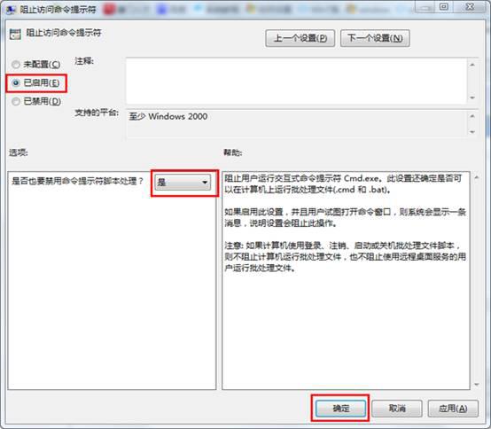 3、在彈出的編輯窗口中,選擇“已啟用”選項(xiàng),將下方“是否也要禁用命令提示符腳本處理”改為“是”,然后按“確定”按鈕保存退出組策略。