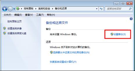 2、在打開(kāi)的系統(tǒng)備份和還原控制面板中可看到, 這里集成了系統(tǒng)備份和還原的所有功能,但是并沒(méi)有開(kāi)啟,點(diǎn)擊“設(shè)置備份”。