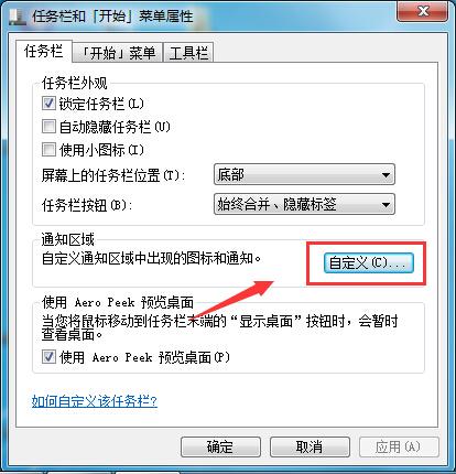 2、在彈出的“任務(wù)欄和開始菜單屬性”窗口中,在通知區(qū)域中選擇“自定義”。