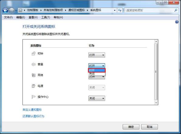 4、在出現(xiàn)的界面中,找到音量,將后面的行為設(shè)置成“打開”,然后點(diǎn)擊確定,