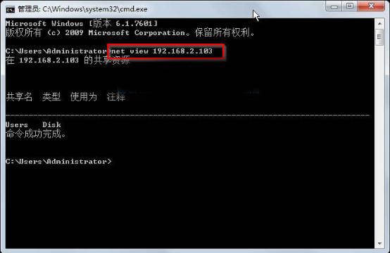 2、比如用戶需要查看192.168.2.103計算機上的共享資源時,在命令提示符光標處輸入“net view 192.168.2.103”命令,按回車即可。