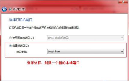 3、在“選擇打印機(jī)端口”的窗口中,點(diǎn)擊“創(chuàng)建新端口”,端口類型選擇:Local Port