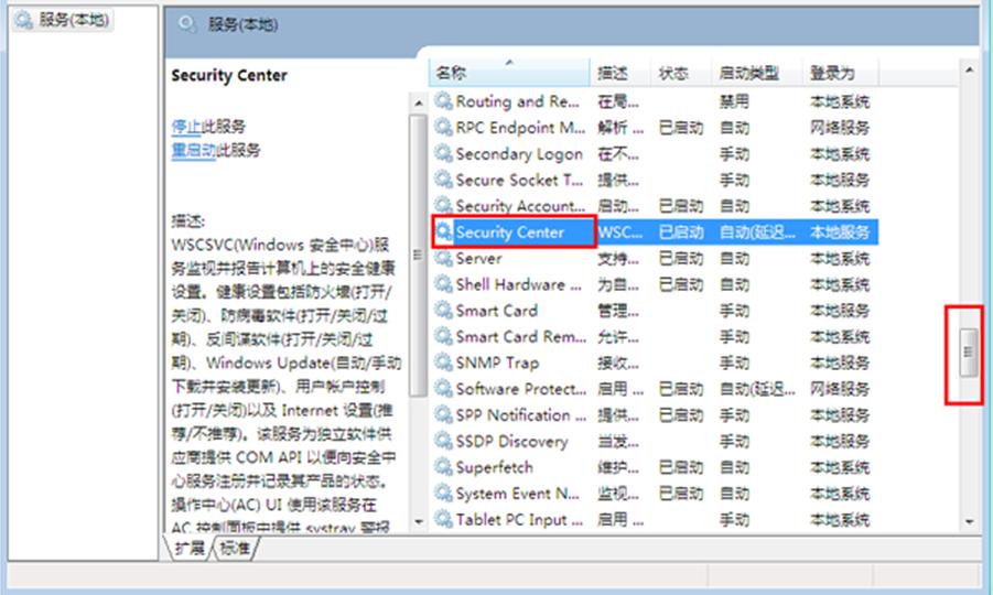 2、在打開的服務窗口中,下拉滾動條找到并雙擊“security center”選項。
