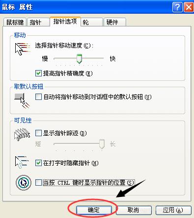 3、切換到“指針選項(xiàng)”標(biāo)簽頁(yè),根據(jù)你所需要的情況,可調(diào)節(jié)指針的移動(dòng)速度,選擇是否要顯示指針蹤跡,打字時(shí)是否想要隱藏指針等等,最后點(diǎn)擊“確定”保存。