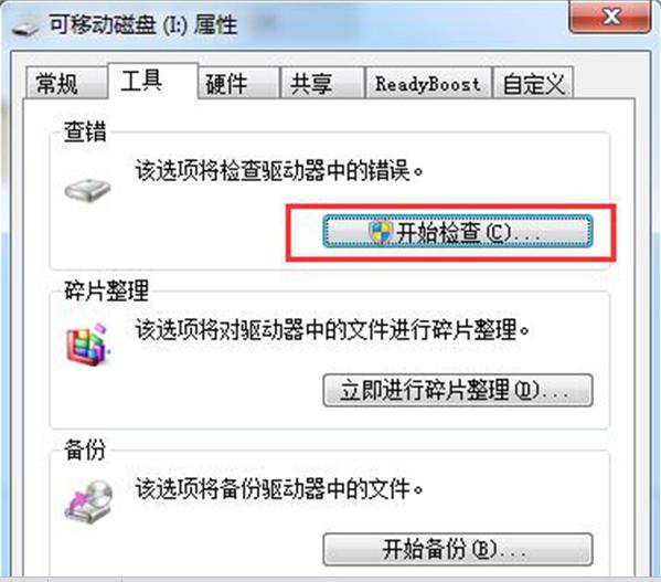 2、在U盤圖標(biāo)上右鍵,選擇屬性,切換到“工具”標(biāo)簽頁,并點(diǎn)擊“開始檢查”。