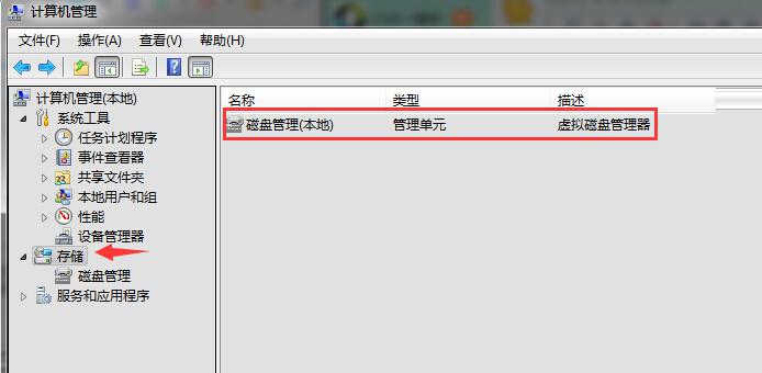 2、在出現的“計算機管理”菜單中,選擇“存儲”下面的“磁盤管理”鍵值。