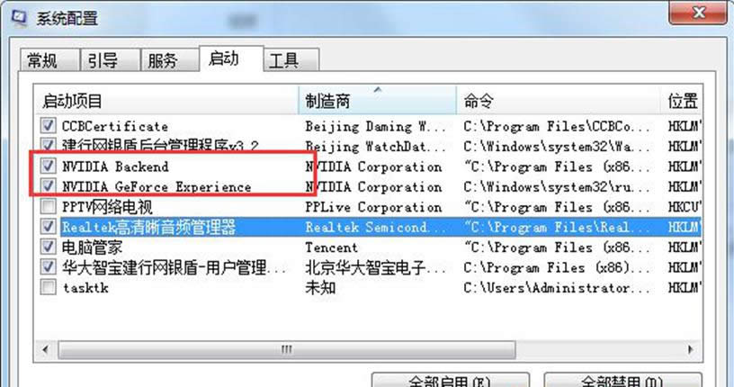 2、在打開的系統(tǒng)配置程序后,切換到“啟動(dòng)”標(biāo)簽頁,取消勾選“NVIDIA”開頭的啟動(dòng)項(xiàng),然后點(diǎn)擊“應(yīng)用”。