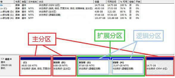 可劃分四個主分區或3個主分區+1個擴展分區(擴展分區中可創建多個邏輯分區),也就是3個主分區+1個擴展分區。