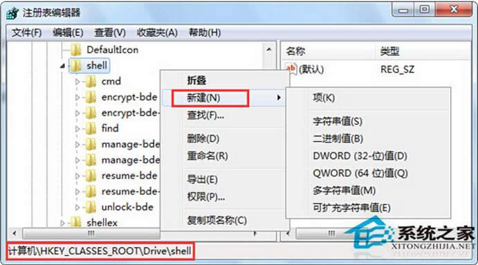 2、在打開的注冊表編輯器窗口中,在左側(cè)窗口依次點擊展開以下注冊項HKEY_CLASSES_ROOT\Drive\shell,