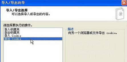1、打開(kāi)保存過(guò)cookies信息的瀏覽器,打開(kāi)“導(dǎo)入/導(dǎo)出向?qū)?rdquo;,單擊“下一步”按鈕,在打開(kāi)的“導(dǎo)入/導(dǎo)出選擇”向?qū)е羞x中“導(dǎo)出Cookie”選項(xiàng),并點(diǎn)擊“下一步”按鈕。