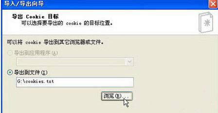 2、在打開(kāi)的“導(dǎo)出Cookie目標(biāo)”向?qū)ы?yè)中,直接點(diǎn)擊“瀏覽”按鈕指定合適的位置和文件名,完成后,點(diǎn)擊窗口下的“下一步”按鈕。