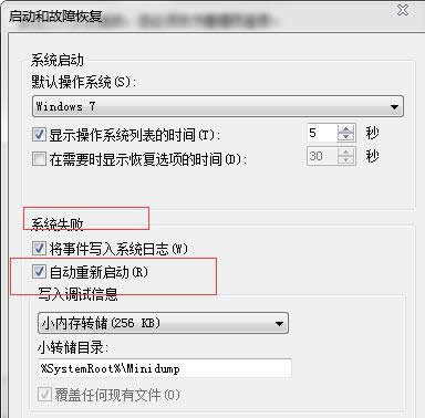 第二步、打開系統(tǒng)屬性面板,在系統(tǒng)屬性面板上切換至“高級”項中,點擊“啟動與故障恢復”處的“設置”按鈕,最后,在“系統(tǒng)失敗”選項下,取消勾選“自動重新啟動”,點擊確定按鈕保存即可。