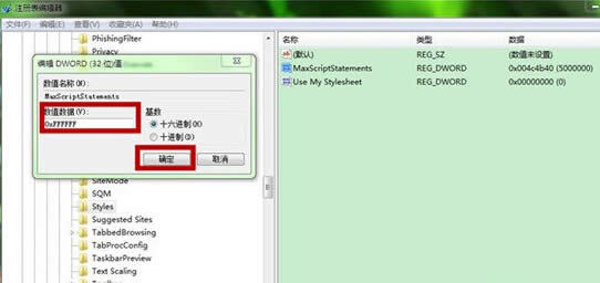 第七步、雙擊“MaxScriptStatements”,把其“數(shù)值數(shù)據(jù)”修改為“0xFFFFFFFF”再點(diǎn)擊“確定”即可保存。