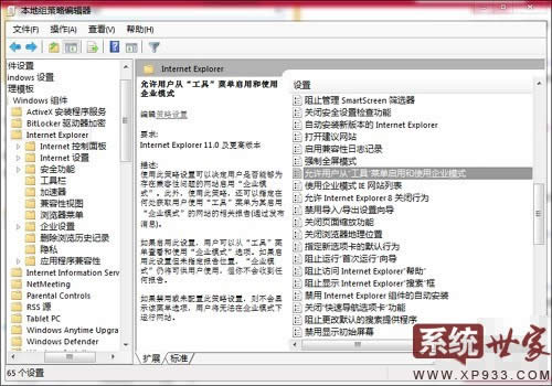2、點擊開始菜單打開運行對話框,輸入gpedit.msc,進入“本地組策略編輯器”; 3、然后依次展開“計算機配置》管理模板》Windows組件》Internet Explorer項目”,在右側找到并雙擊“允許用戶從“工具”菜單啟用和使用企業模式”項;