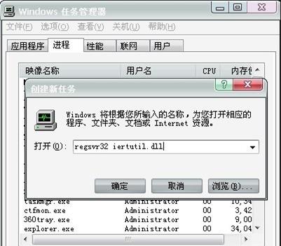 4.然后打開任務(wù)管理器,在運(yùn)行框中輸入“regsvr32 iertutil.dll”。一般這樣就解決了。