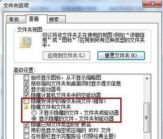 2.在文件夾選項(xiàng)窗口中切換“查看”選項(xiàng)卡,在高級(jí)設(shè)置一欄將“隱藏受保護(hù)的操作系統(tǒng)文件”前面的勾選去掉,然后再選中“顯示隱藏的文件、文件夾和驅(qū)動(dòng)器”復(fù)選框,點(diǎn)擊“確定”!
