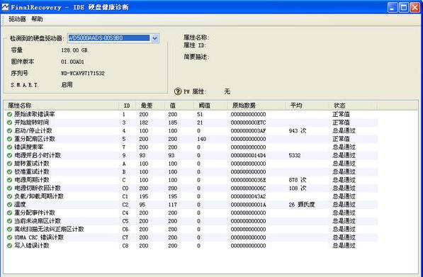 | Windows 7,中文名稱視窗7,是由微軟公司(Microsoft)開發的操作系統,內核版本號為Windows NT 6.1。Windows 7可供家庭及商業工作環境:筆記本電腦 、平板電腦 、多媒體中心等使用。Windows 7可供選擇的版本有:入門版(Starter)、家庭普通版(Home Basic)、家庭高級版(Home Premium)、專業版(Professional)、企業版(Enterprise)(非零售)、旗艦版(Ultimate)。 今天Win7系統之家給大家帶來的是利用FinalRecovery軟件對Win7系統IDE硬盤健康診斷的方法。如果你也想對IDE硬盤進行健康診斷的話,請跟著小編以下的健康診斷的方法來操作吧。一、準備工作: 1、下載FinalRecovery數據恢復軟件。 二、健康診斷步驟 1.打開FinalRecovery的主界面,點擊“IDE硬盤健康診斷”。 ![]() 2、系統執行操作后,窗口中就會顯示了硬盤驅動器的診斷信息了。 windows 7 的設計主要圍繞五個重點——針對筆記本電腦的特有設計;基于應用服務的設計;用戶的個性化;視聽娛樂的優化;用戶易用性的新引擎。 跳躍列表,系統故障快速修復等,這些新功能令Windows 7成為最易用的Windows。 |
